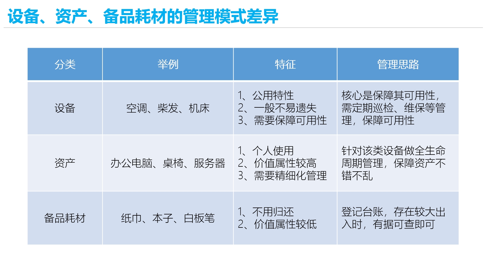 1. 资产分类管理:针对不同的类型,分为设备设施、固定资产、备品与耗材三大类,满足不同的管理需求。