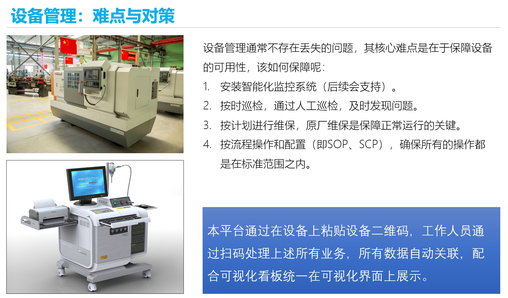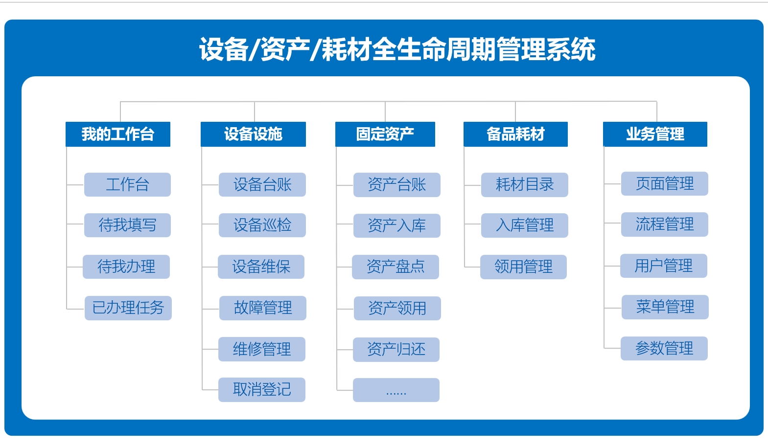 1. 资产分类管理:针对不同的类型,分为设备设施、固定资产、备品与耗材三大类,满足不同的管理需求。