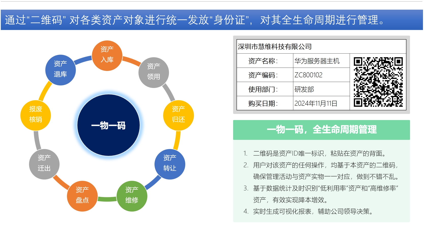 慧维资产全生命周期管理系统是一套可用于各类大中小企业、酒店、工厂、仓库、商超、医院、学校、政府、军队等多种场景下的资产管理系统,其具备以下特性: